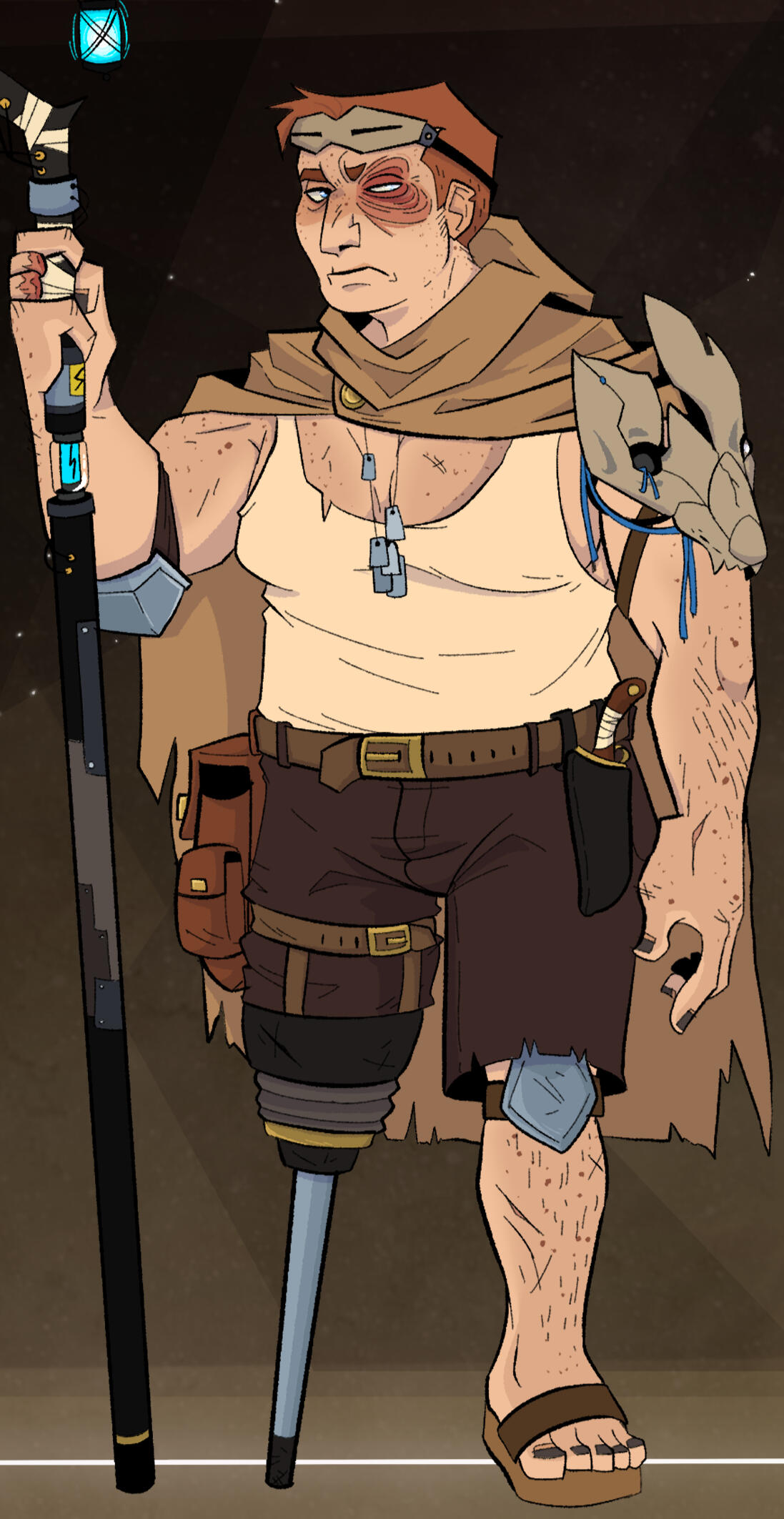 Appearance: Midas is a tall, broad, middle-aged woman, heavily scarred from years of survival. She has red hair, chronically sunburnt skin, and pale blue eyes. In place of her right leg, she wears a peg-style prosthetic.